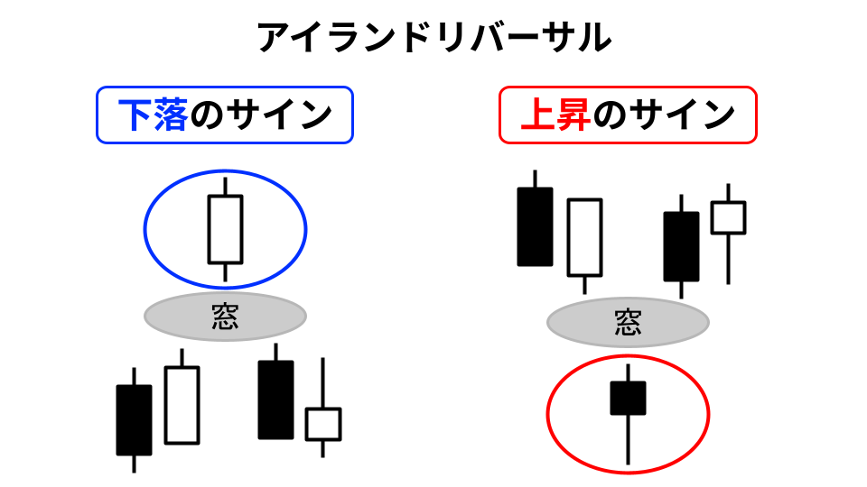 アイランドリバーサルは、チャート上でローソク足が「窓」を開けて上昇(または下落)したのち、今度は逆に「窓」を開けて下落(または上昇)した場合にできる離れ小島のようなチャート形状を指します。