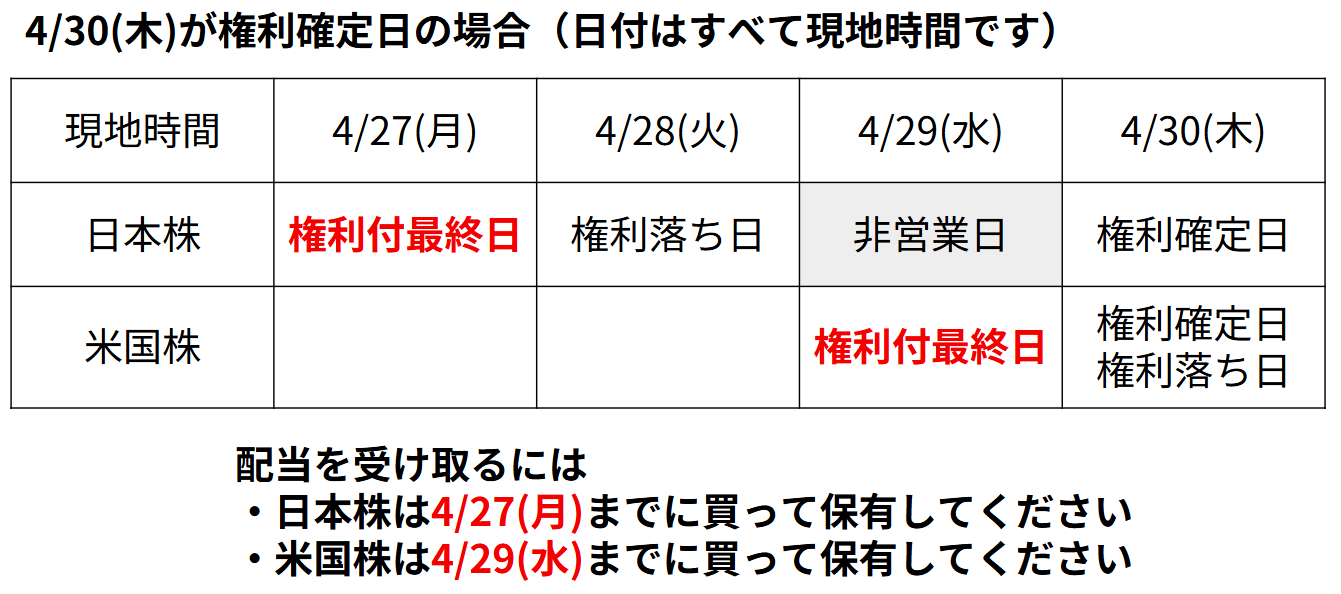 4月の日本株の場合は、4/27(月)が権利付最終日で、4/28(火)が権利落ち日になります。米国株は日本株のように月末が権利落ち日というわけではなく、企業によりバラバラですのでご注意ください。
