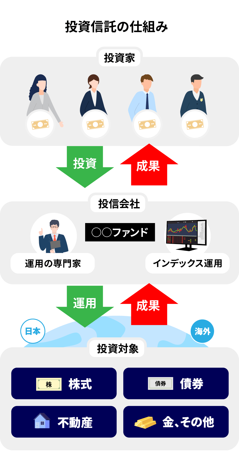 投資信託とは、たくさんの投資家から集めたお金をひとつにまとめ、運用のプロ(ファンドマネージャー)が株式や債券などに投資・運用する金融商品です。