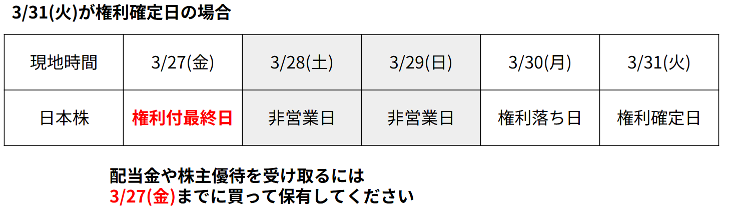 3月の場合は、3/27(金)が権利付最終日で、3/30(月)が権利落ち日になります。
