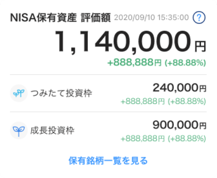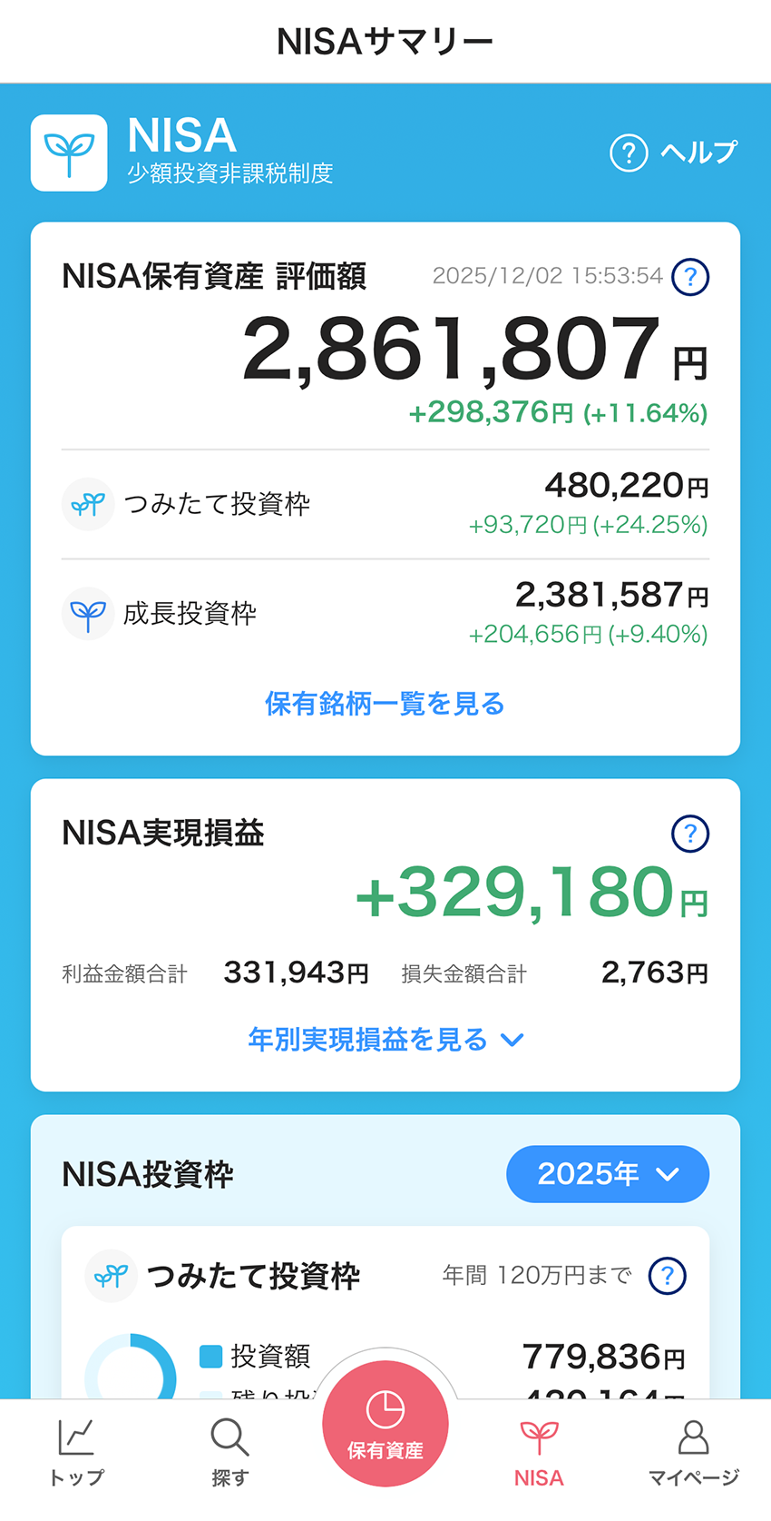 まず画面を開くと、一番上に現在の「NISA保有資産 評価額」が表示されます。