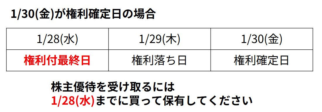 この日までに株を買って保有すると、株主優待をもらう権利が得られます。投資家にとって最も重要な日です。この日までに売ってしまうと権利は得られません。